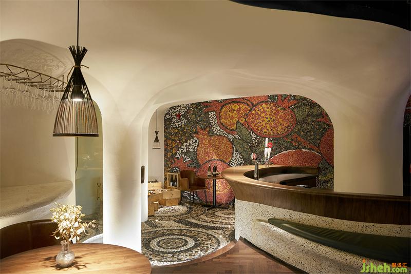 人們推開如同軟木瓶蓋的把手,首先映入眼底的是一整片馬賽克拼貼的紅石榴壁畫,上海餐廳設(shè)計鮮紅欲滴的色彩,仿佛空氣彌漫出如sangría(西班牙的一種汽酒)那樣迷人果味。
