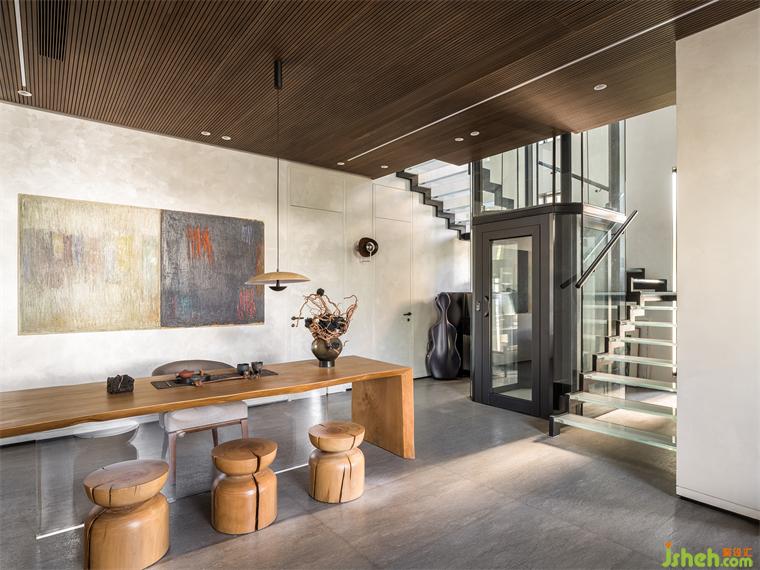 懸浮式樓梯結(jié)合電梯,雙動線并一的設計,打破傳統(tǒng)樓梯的認識,增加空間利用率,使其稱為整個空間的視覺主體。別墅改造設計每階獨立成塊嵌入墻體,并嵌入燈條,伴隨著上下兩層窗外灑進的豐盈光線,不管是白天還是晚上,陽與陰、明與暗、光與影的互動,階梯視覺上的漂浮狀與拾步而上的踏實感,神圣、浪漫又自在。