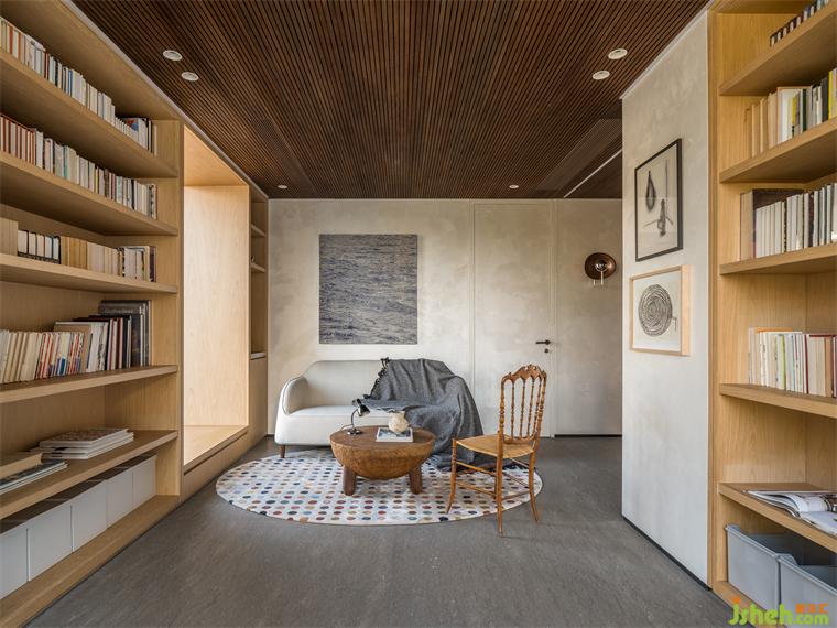 別墅改造設計考慮到孩子在成長過程中最重要的是陪伴和互動,也希望能夠讓孩子將學習與生活分開,樓梯上來,便是一個開放式書房,使二樓的空間利用率達到最大化。延續(xù)一樓的設計元素,原木色的書柜可以容納業(yè)主大量的書籍。