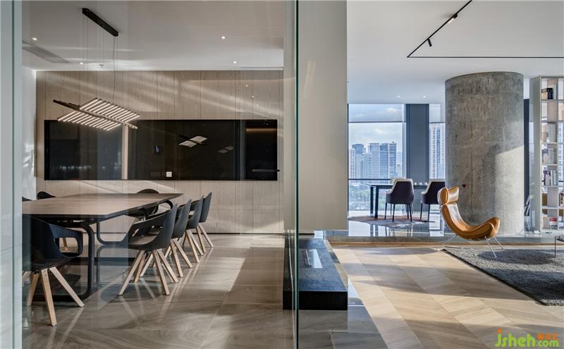 由于整棟大樓玻璃幕墻結(jié)構(gòu),因此工作室就像一個(gè)三面體的玻璃盒子,光線充足。豐富的玻璃隔斷形成通透的空間,相互貫穿,模糊了空間屬性。每個(gè)空間并非獨(dú)立存在,而是相互銜接。敞亮通透的空間,削弱了墻體結(jié)構(gòu)帶來的局促感,為團(tuán)隊(duì)成員之間的溝通、互動(dòng)塑造了一個(gè)開放的辦公環(huán)境。辦公室設(shè)計(jì)