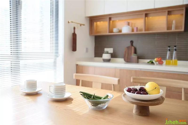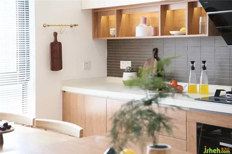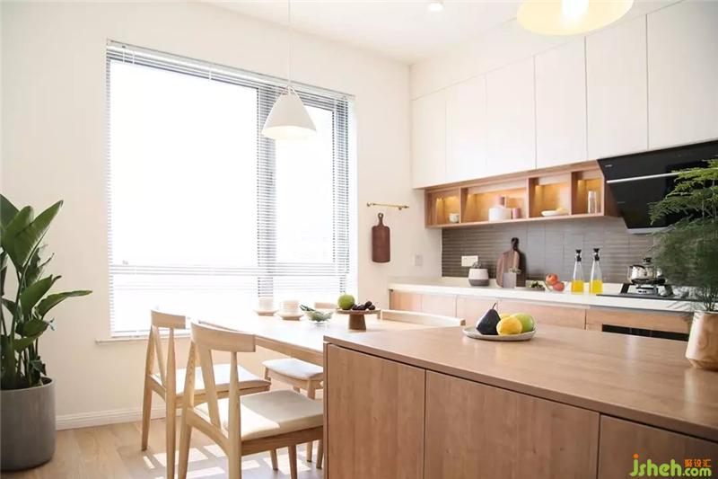 廚房望出去也是金雞湖的景色,讓做菜成為一種享受。中島的操作臺(tái)與餐桌結(jié)合,增加儲(chǔ)藏功能和西廚的操作空間。