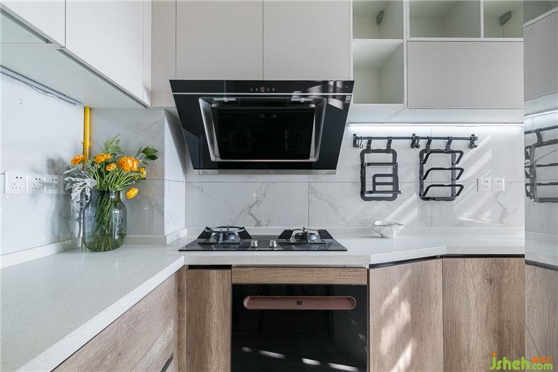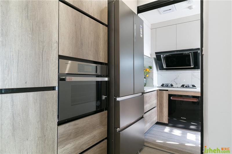廚房門設(shè)計(jì)成三折的推拉門,油煙不大的時(shí)候可以隱藏在冰箱側(cè)面(其實(shí)大部分是打開的),廚房的空間更加的通透。