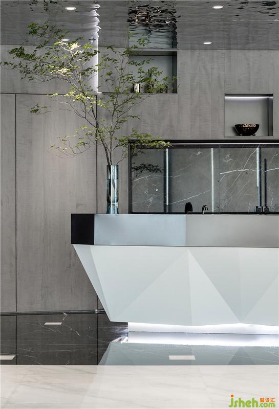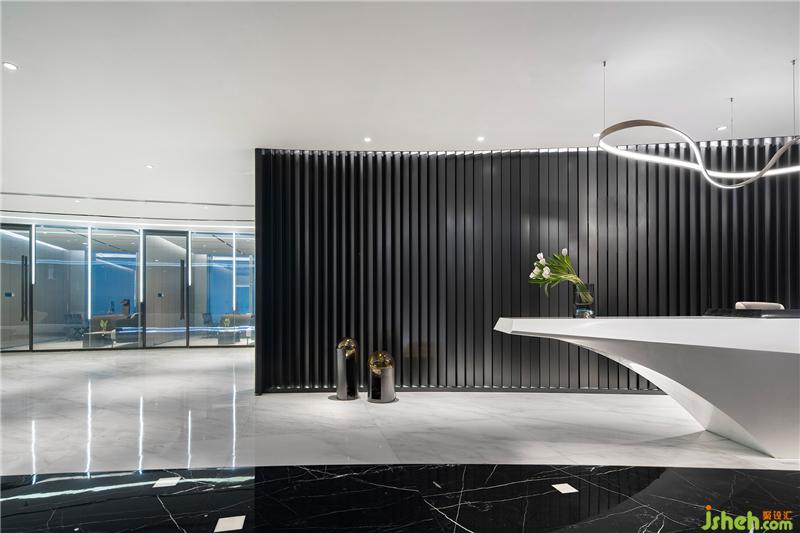 入口處的接待臺將來者的視野引入整個空間。材質(zhì)是空間的語言,背景的不銹鋼豎條通過不同的角度排列形成似風拂過的琴鍵變化?!凹{自然之形,建空間之意”。辦公室設(shè)計