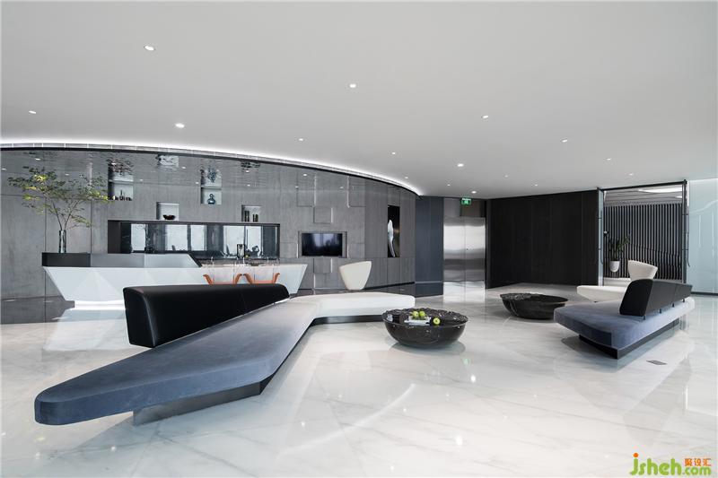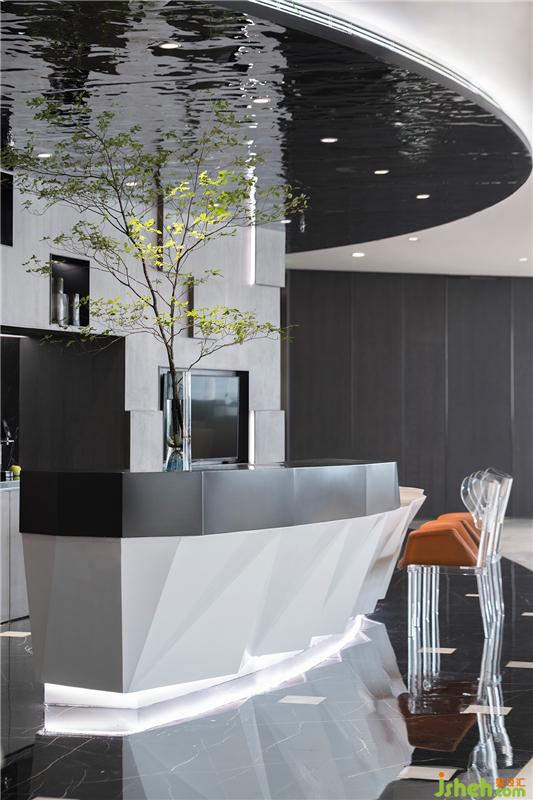 水吧臺的頂面、地面、墻面劃出一個獨立區(qū)域塊,切面的造型則呼應大廈的建筑結(jié)構(gòu),使得硬裝與建筑相融,軟裝自硬裝中生長。