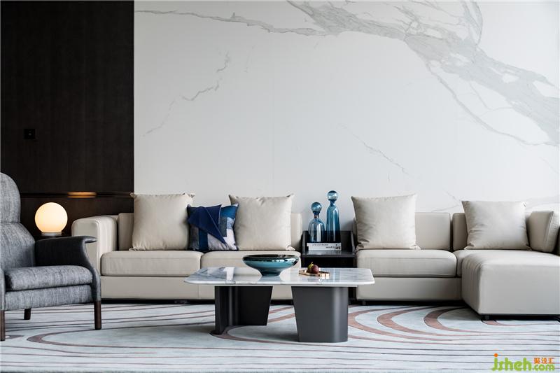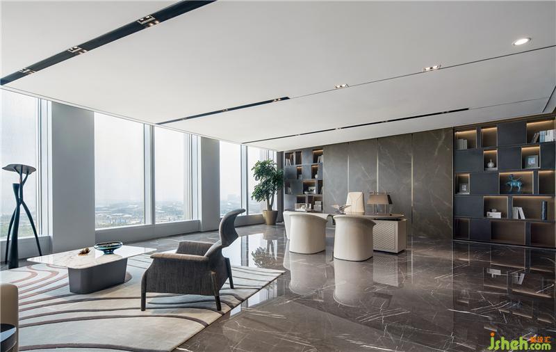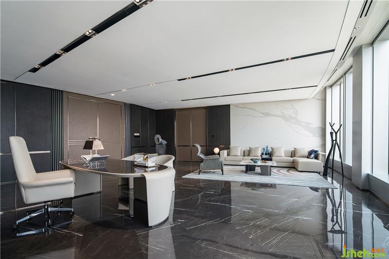 公共區(qū)域由獨立的門廳過渡到vip商務室。通過面部識別后,兩扇門緩緩開啟--儀式感和科技感正是通過這樣的場景傳達給來訪者。整排的落地窗外,映入眼簾的是一覽無余的絕佳海景,帶來在云之巔的尊貴體驗。