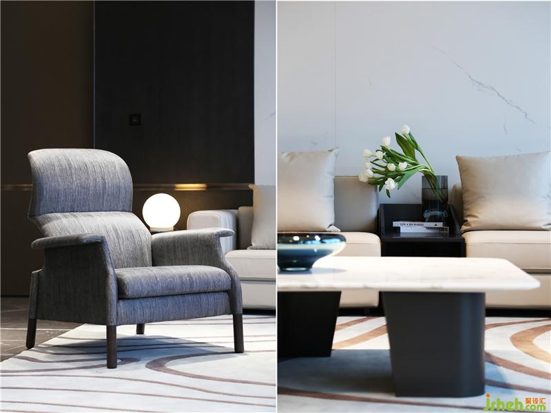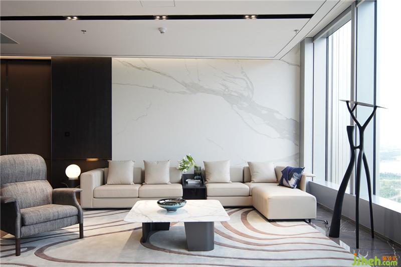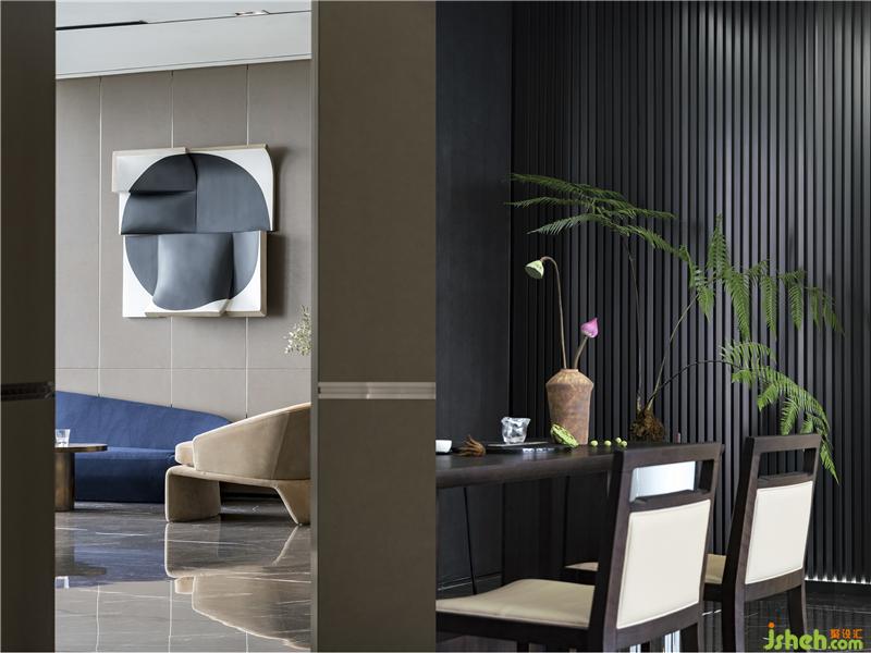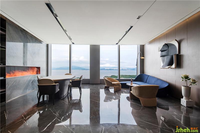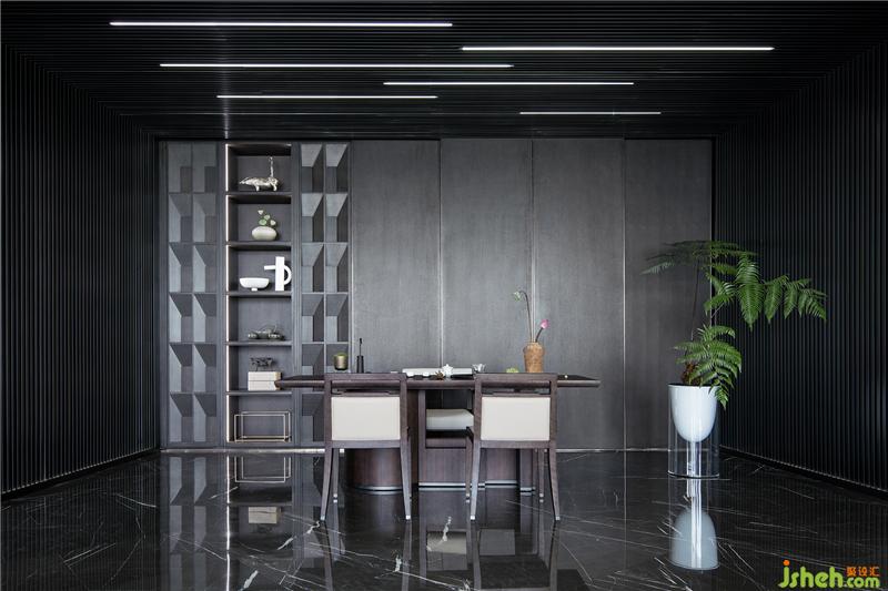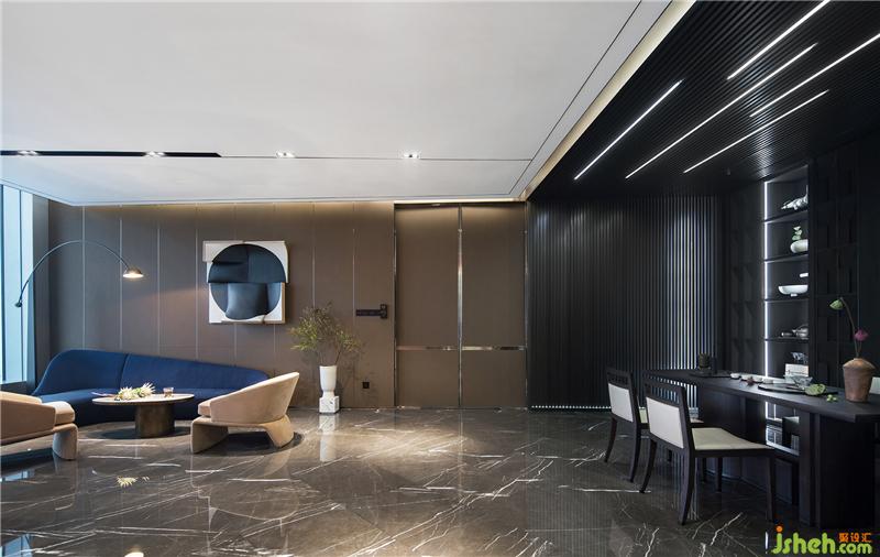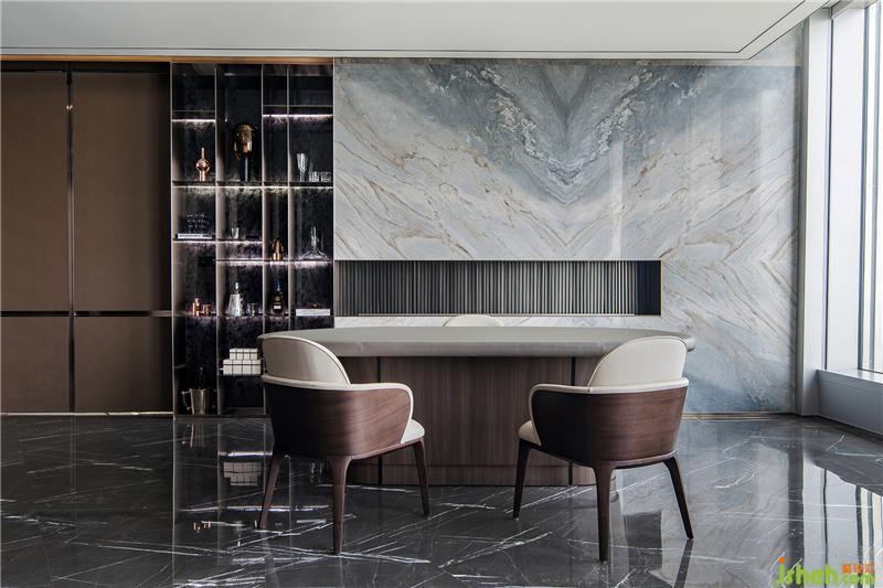 茶室和德州撲克/品酒區(qū)集合在休閑區(qū),東西方的商務接待禮儀的協(xié)調共融。磨砂皮質地/羊毛呢/石材的材質凸顯高貴品質,配合舒適和開闊的景色,旨在打造開懷暢飲相聚言歡的場景體驗。