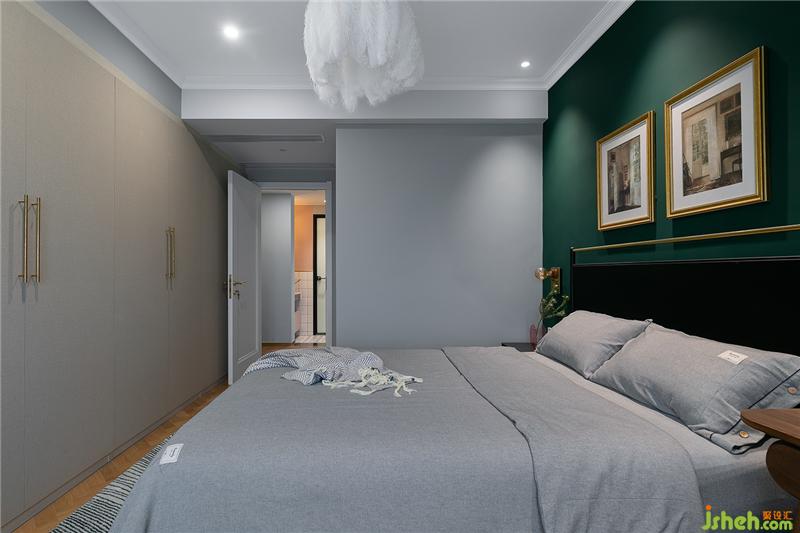 主臥延續(xù)客餐廳的設(shè)計元素,羽毛燈再添柔美氛圍。
