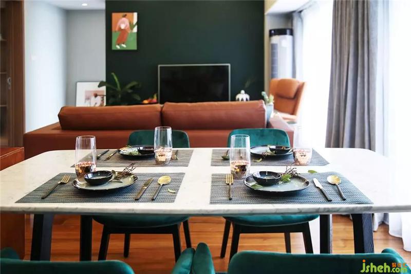▲我們確定了主色調(diào)之后,通過兩種方式來體現(xiàn)主色調(diào):大面積和高頻次,通過電視背景墻的色彩大面積定調(diào),再通過小物體的不斷重復,比如同色調(diào)的掛畫、綠色大理石的花器、餐墊、抱枕、柜子的門板等不管是什么綠色都屬于一個色調(diào)。