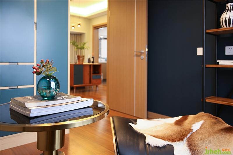 ▲飽和度高但明度極低的墨綠色和深海藍的墻面,配合大面積的淺灰色墻面,將紅木地板的熱烈結(jié)合,但又保留了其鮮明的個性,彼此牽制又各自散發(fā)著獨特的光彩。室內(nèi)設(shè)計師