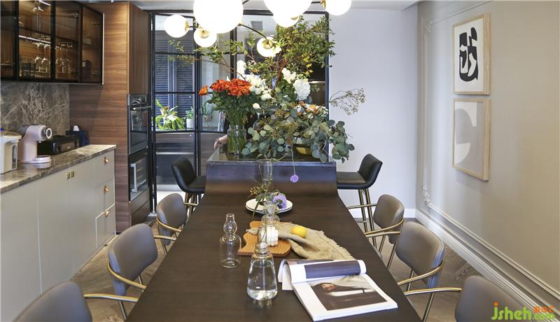 1.餐桌和吧臺(tái)結(jié)合形成一個(gè)多功能區(qū)域,日常生活,朋友聚餐,花藝分享會(huì);