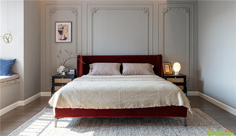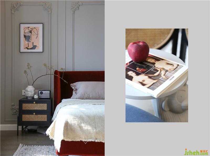 書(shū)柜位置以玻璃柜和造型柜門(mén)板結(jié)合出現(xiàn),將空間的呼吸感呈現(xiàn)出來(lái)。梯形柜體既緩解了中央空調(diào)形成下壓空又增強(qiáng)空間的包圍感;書(shū)桌整體以皮質(zhì)出現(xiàn),因地插壞掉的幾率較高,故插座接線提高到書(shū)桌柜體側(cè)面。室內(nèi)設(shè)計(jì)師
