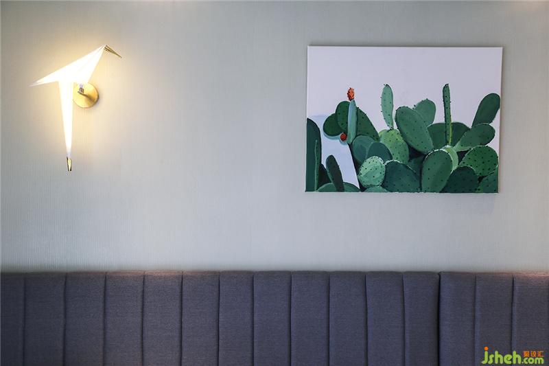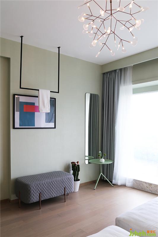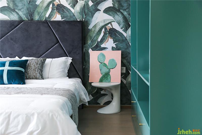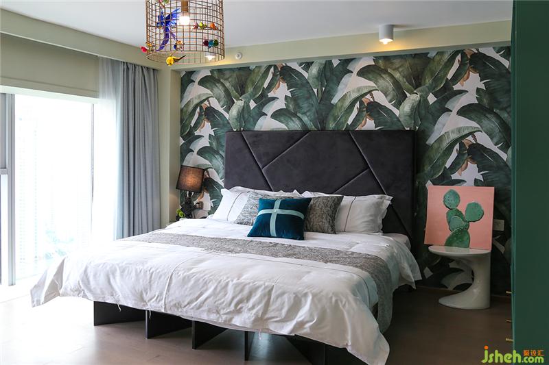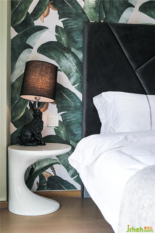 狂歡結(jié)束之后,來(lái)到二樓的臥室睡個(gè)好覺(jué)。日出時(shí)拉開(kāi)窗簾,陽(yáng)光灑在屋內(nèi),大塊芭蕉葉組合而成的背景墻更顯蔥郁。