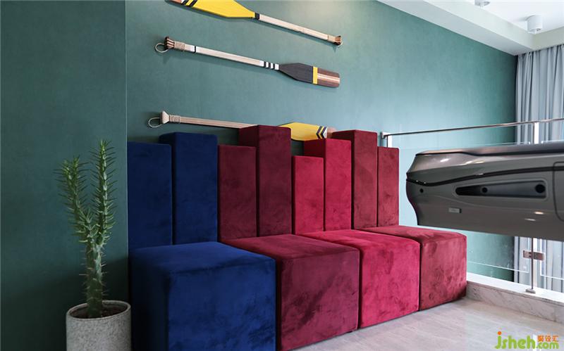 造型簡(jiǎn)約的深藍(lán)色坐椅卓爾不群,優(yōu)雅的放在在落地窗旁,坐在上面望向遠(yuǎn)方,不禁沉迷于這江天一色。