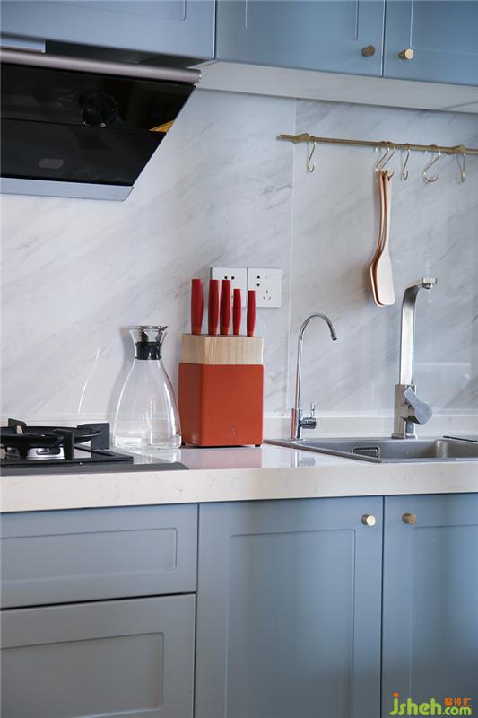 以前從來不做飯的屋主希望未來的生活可以慢慢回歸家庭,雖然廚房的面積讓給了餐廳一部分,但是廚房還是五臟俱全的,洗碗機(jī)主要是給兩個(gè)小孩洗水果,蒸箱、烤箱、微波爐一應(yīng)俱全。廚房整體空間帶有一些簡(jiǎn)潔的溫馨氣質(zhì)、通過選擇灰藍(lán)色柜體搭配石英石臺(tái)面,與客廳氛圍相呼應(yīng),更注重實(shí)用性和空間的溫馨舒適。室內(nèi)設(shè)計(jì)師