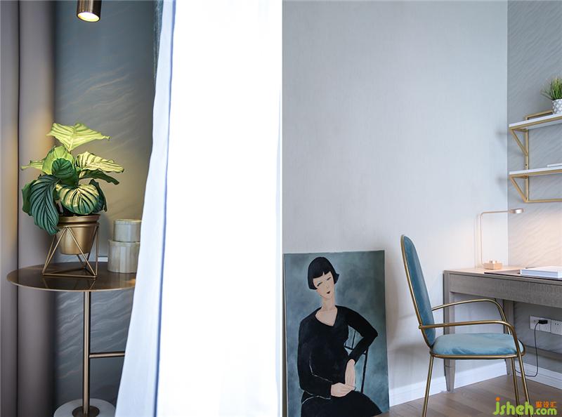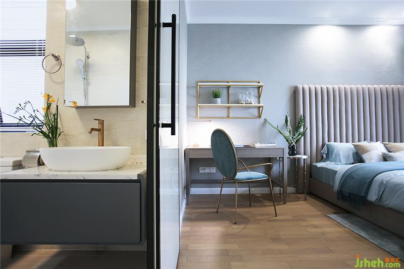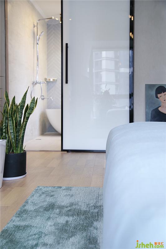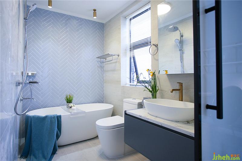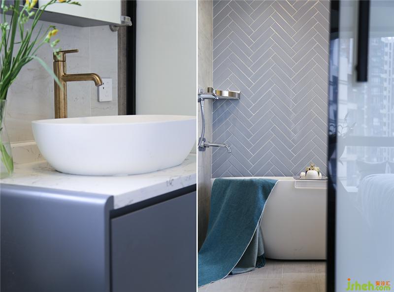 靠近衛(wèi)生間的浴缸墻面,使用淺藍色的人字拼磚,形成海面的波浪,泡澡的時候也能感受到海的味道。