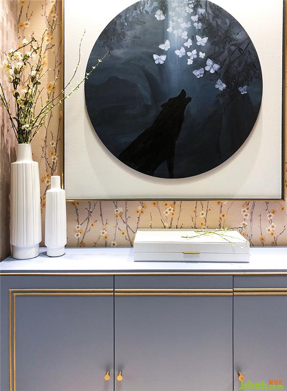 浪漫的藍(lán)灰色玄關(guān)柜和充滿故事的掛畫