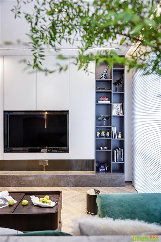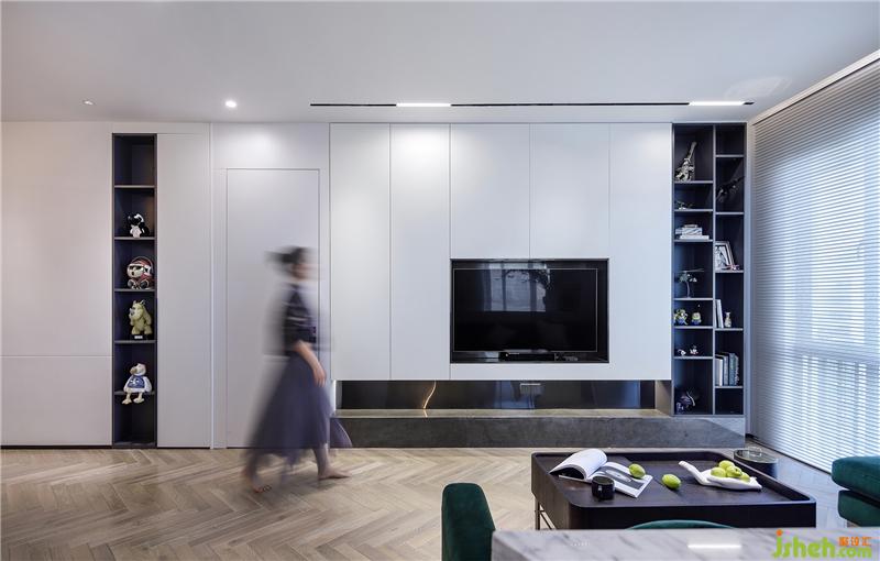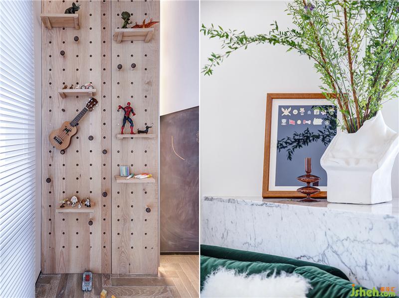 通過天花木飾面材質(zhì)和異形石材的視覺劃分,使得客廳的空間通過分區(qū)設(shè)計更加方正。主臥房門隱藏在客廳的背景墻面,整體明亮簡潔的造型會讓空間看起來更加的開敞,同時背景墻隱藏大量儲物空間,這也是兜兜需要的一種居住狀態(tài)。室內(nèi)設(shè)計師