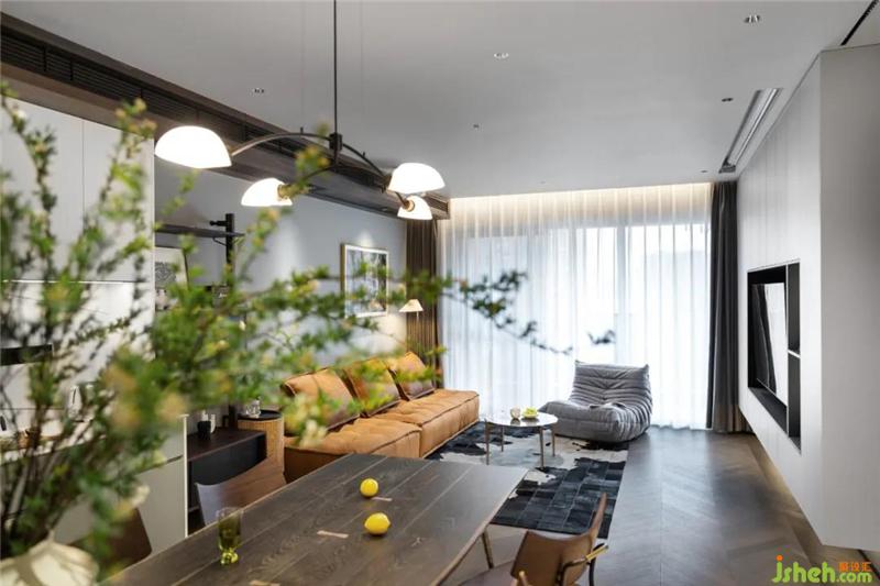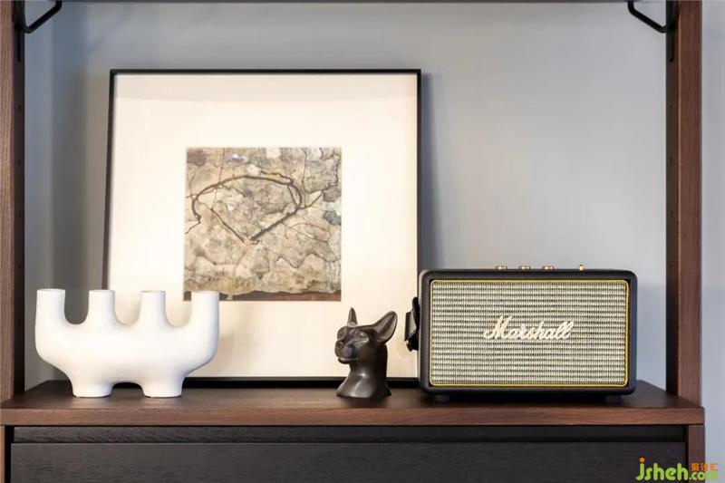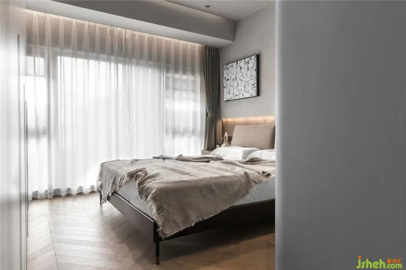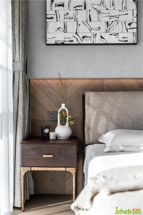 主臥的背景墻灰色與木色,一個溫暖一個冷靜和抽象的畫面形成空間構(gòu)成。