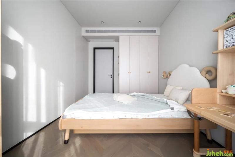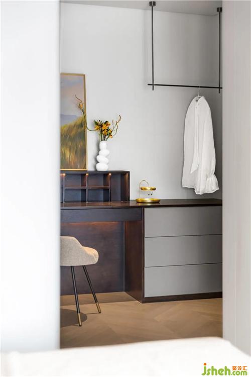 主臥的面積雖然不大,也被設(shè)計師擠出來一組衣帽間套件,4.2米長的整排衣柜及多功能梳妝臺,結(jié)合次凈衣+收納+梳妝臺+置物架+首飾盒的多種使用功能組合,足夠多的空間給女主放置衣服、化妝品、飾品等。