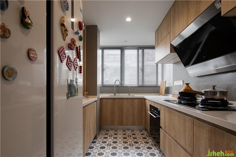▲廚房-復(fù)古花磚與暖棕色的木質(zhì)色彩搭配,給人嫻靜、舒適的感受。