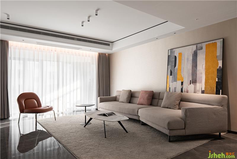 沒有多余的裝飾線角,客廳暖棕色的棉麻沙發(fā)搭配同色調(diào)地毯,與傾瀉而入的陽光相呼應(yīng),營造舒適高端的居住氛圍。