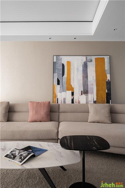 作為視線聚焦的背景墻,則搭配了明亮色彩的現(xiàn)代抽象畫作。
