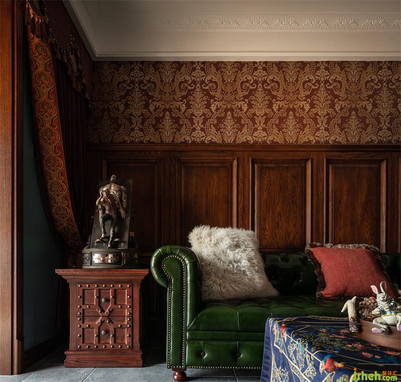 絲絨、流蘇、羊毛、墻板、大馬士革壁紙,搭配暗黑系手辦,讓空間更神秘更捉摸不透,個性值滿分。