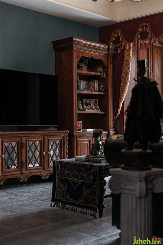 墻紙窗簾都用了復(fù)古的酒紅色系,與墨綠相碰撞,這種高飽和度的顏色對比更能體現(xiàn)古堡和宮廷的華麗和張揚(yáng),絲絨和羊毛材質(zhì)搭配溫潤的木頭,又能增加空間的質(zhì)感,更貼合古堡的風(fēng)格,茶幾上的暗黑小丑兔邪惡又迷人~強(qiáng)行入鏡。
