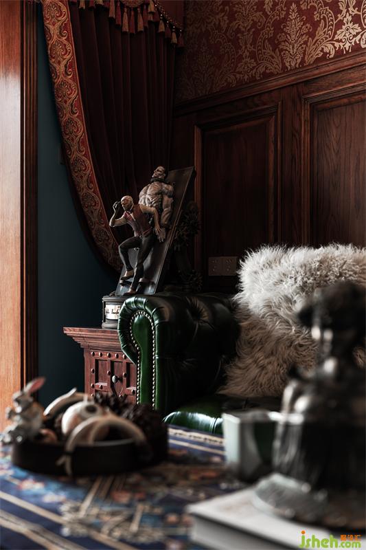 客廳采用了古堡里常用的墻板搭配大馬士革壁紙,華麗又復(fù)古,地磚也用了仿古磚,增加一點(diǎn)粗獷和滄桑感,沙發(fā)選用了墨綠色的切斯特菲爾德沙發(fā),搭配一把皮質(zhì)的搖椅,搖椅的靠背是皮毛的,溫暖又野奢,粗獷又舒適。沙發(fā)兩邊的手辦是家里最大號的兩個,用自己的心愛之物當(dāng)裝飾,家就有了自己的味道。