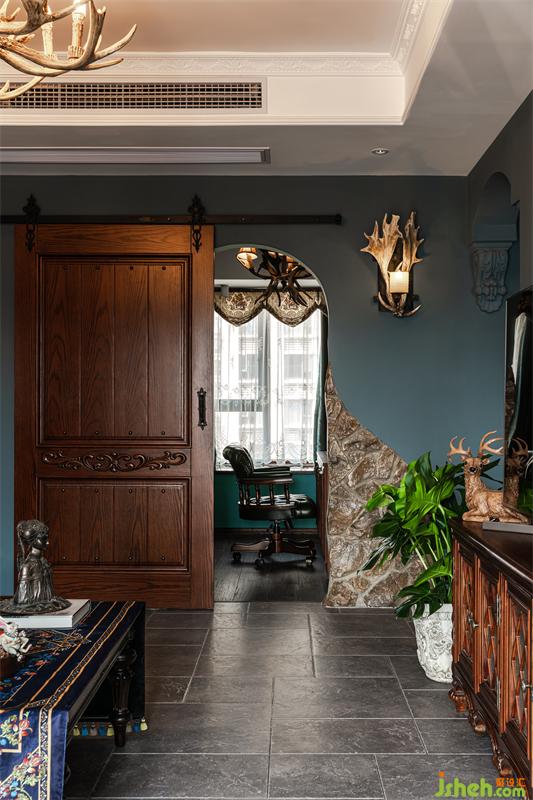 客廳看主臥。雕花的橡木谷倉門,搭配裸露出原石的破敗墻腳,仿佛一個久久無人問津的古堡里,隱藏著一個跨世紀(jì)的驚天大秘密……(此處有bgm~)鹿角壁燈昏暗的燈光既增加氛圍,也能在晚上照亮過道這一主動線,有顏又實(shí)用。