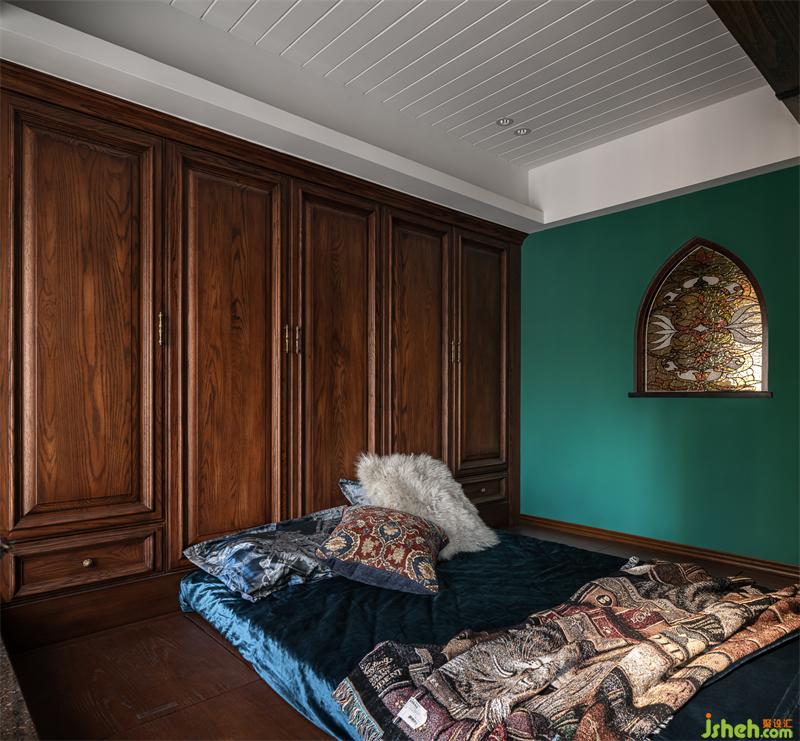 主臥采用榻榻米的形式,增加儲物,衣柜做成墻板的樣式,既是背景,又有實(shí)用性。墻上的教堂玻璃對著過道,增加過道的自然采光。