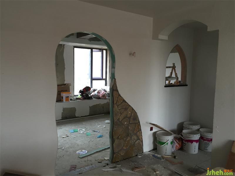 ▲施工階段。文化石是內(nèi)嵌進(jìn)墻體,跟墻做平的,這樣才會有墻面破敗,粉層磨掉了露出原石墻腳的感覺,靈感出自《僵尸新娘》的電影場景。教堂玻璃需要做窗戶的木工師傅留出窗戶形狀的模板,按模板形狀大小定制玻璃。