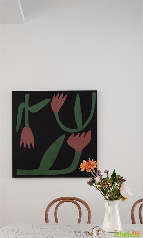 充滿童真的桌布和掛畫相呼應(yīng),透露出家的煙火氣。掛畫“不會(huì)凋零的花”來(lái)自英國(guó)藝術(shù)家Marcello Velh。