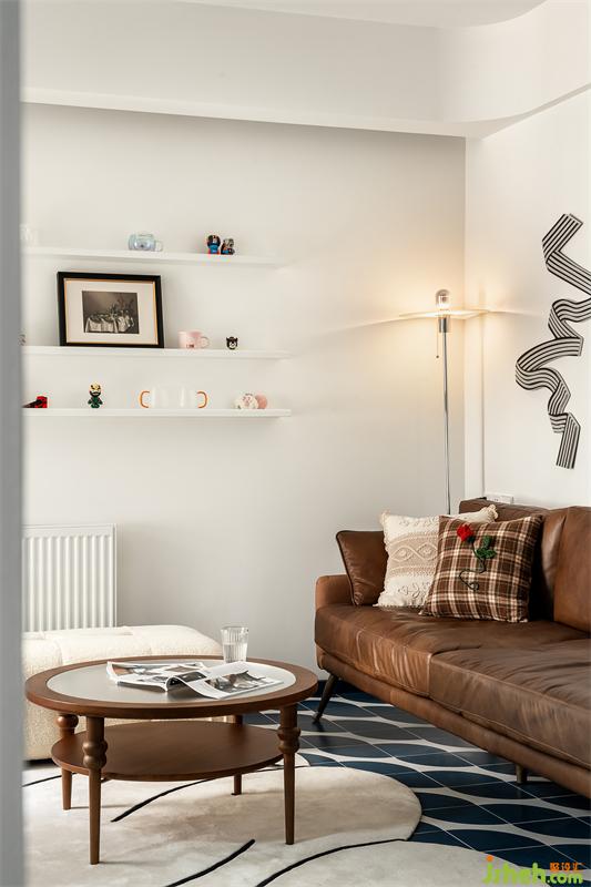 客廳地面貼了幾何形狀的地磚,讓空間更有動(dòng)感。一進(jìn)門就能看到的墻面上做了層板架,放置主人從各地收羅來(lái)的紀(jì)念品和公仔,打破了傳統(tǒng)的“沙發(fā)背景”和“電視背景”的背景墻模式。