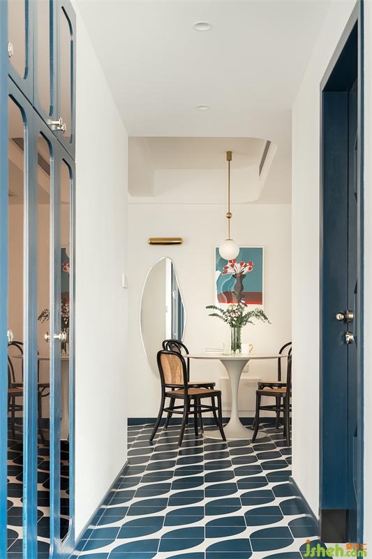 從主臥的門口看走道及餐廳。吊頂也做成了弧形,用造型感削弱空間的局促感。左邊借了墻厚做了一排儲(chǔ)物柜,柜門鑲嵌了茶鏡,擴(kuò)大了空間感。
