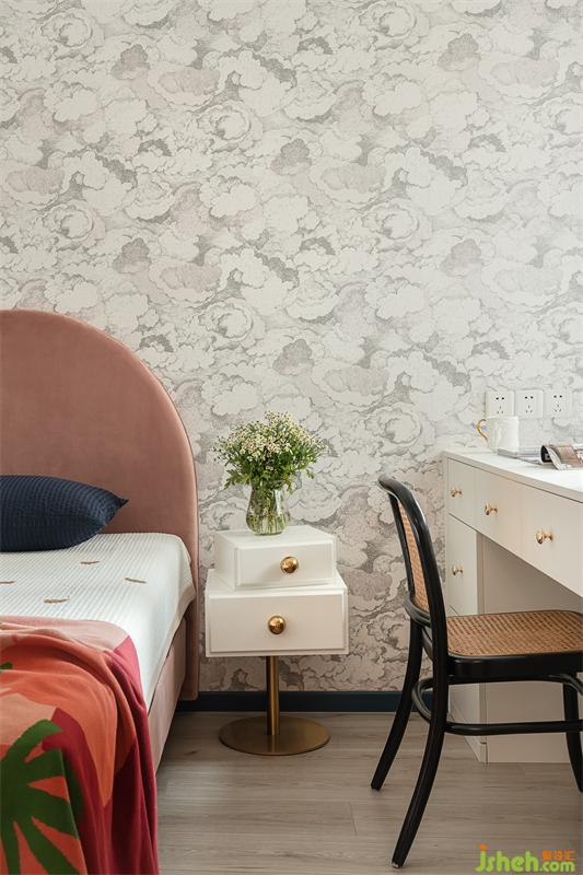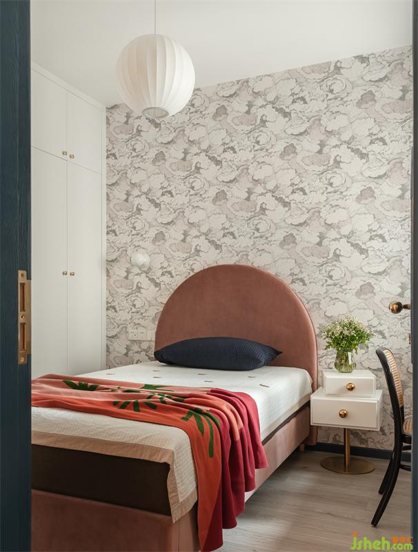 女兒房用了淡粉色的云朵墻紙,云朵仿佛在移動(dòng),有種靜謐的活力。粉色的半圓床頭將公主心進(jìn)行到底,俏皮可愛,最鮮艷的針織搭毯則是點(diǎn)睛之筆,把空間主題色的飽和度,從墻紙到床到搭毯,由低拉到最高,層次分明。