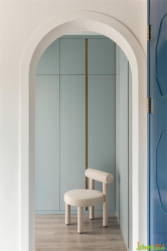 主臥通向衣帽間的門洞也采用了弧形的設(shè)計(jì),衣帽間比較小,選了更溫和的灰綠色,莫蘭迪色系在視覺上有收縮功能,能讓空間顯得更寬敞更讓人放松。公主的衣櫥就是要爽朗精致。