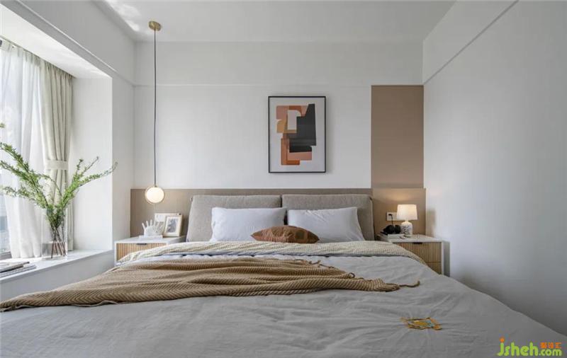 床尾一整排超大的收納+梳妝臺的結(jié)合,滿足強大衣物收納的同時最大化利用空間,白色的柜門與整體的墻面一致,整體干凈美觀。