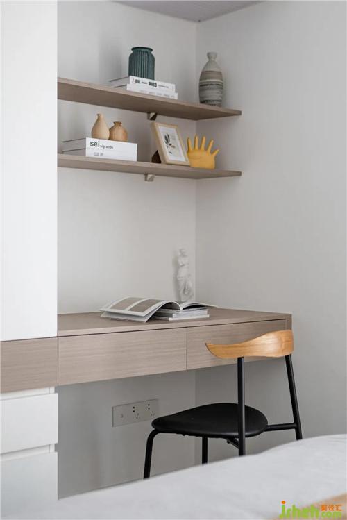展示架可以放置一些小擺件和書(shū)籍。梳妝臺(tái)與衣柜使用穿插的手法,抽屜外置既能滿足女屋主日常存放護(hù)膚品的需求,也可以使衣柜做滿掛衣區(qū),功能的區(qū)分更加明顯。臺(tái)下還預(yù)留了插座備用。