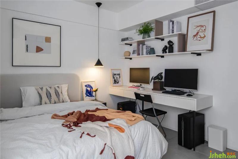 次臥目前作為屋主二人的休閑看書(shū)空間,用于采光的窗也有一個(gè)轉(zhuǎn)折的飄窗臺(tái)(不得不說(shuō)頑固性的飄窗臺(tái)不能打掉改成落地窗真是有點(diǎn)浪費(fèi)),窗臺(tái)作為充電閱讀區(qū)域,將它包裹起來(lái)延出一部分空間用來(lái)放置書(shū)籍,閱讀時(shí)隨手拿取,十分便利。