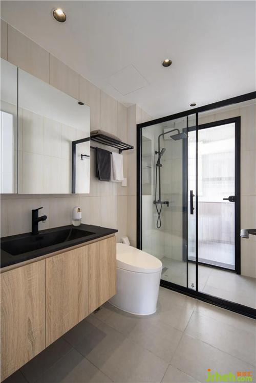 衛(wèi)生間原本陰暗狹小,改造為干濕分離,原生活陽(yáng)臺(tái)的動(dòng)線由廚房改為衛(wèi)生間,選擇透光不透人長(zhǎng)虹玻璃門(mén),增加了廚房的操作臺(tái)面,也增加了衛(wèi)生間的采光。