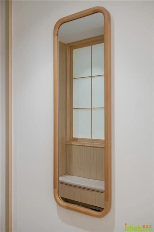 玄關(guān)處的穿衣鏡正好映射廚房的開窗處,兩個(gè)空間的互動(dòng)性增強(qiáng)。