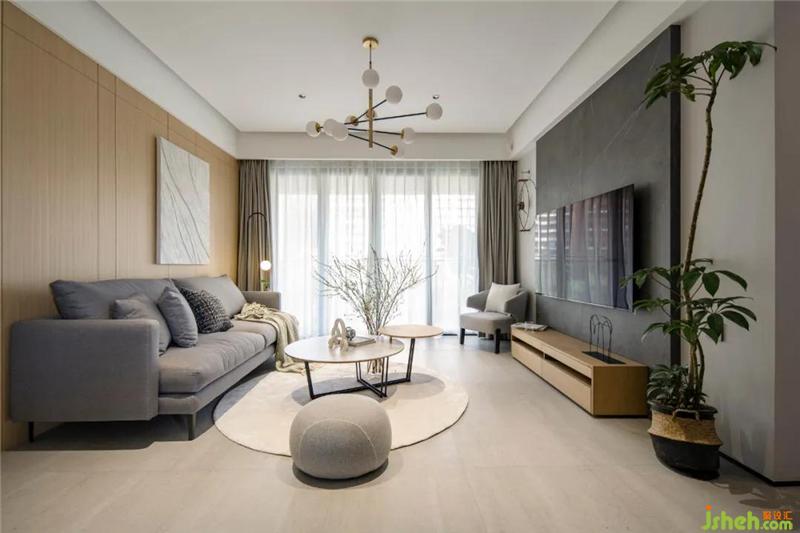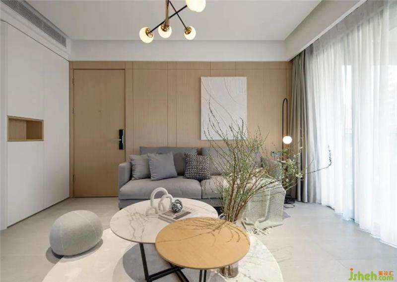 木飾面背景墻將沙發(fā)區(qū)域包圍,包括門的材質保持一致性,讓沙發(fā)背景墻形成一個整體.