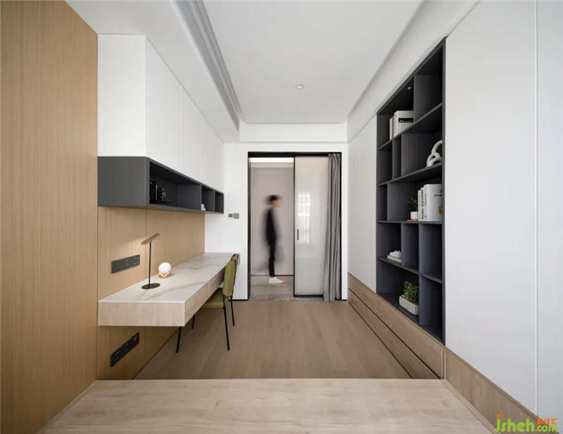 右手邊做了一面墻的衣柜,衣物再多也能收納進(jìn)來。