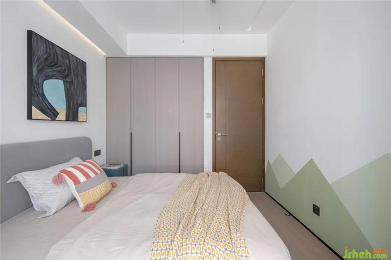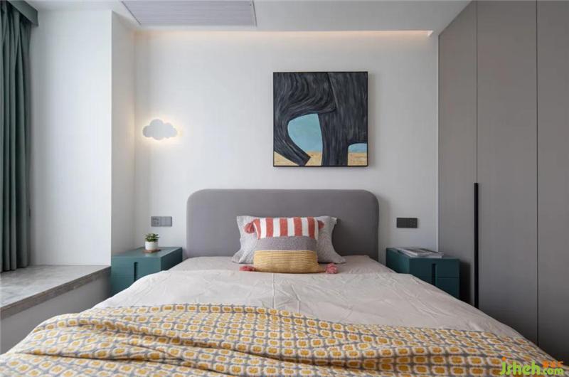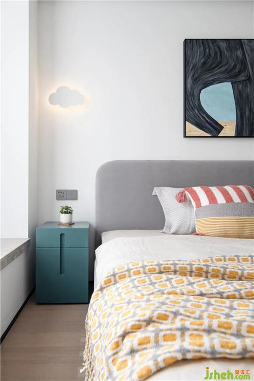 屋主家里目前還沒有小朋友,所以兒童房的設(shè)計(jì)沒有做很多趨于性別化的細(xì)節(jié),云朵燈及大象的裝飾畫充滿童趣深圳裝修設(shè)計(jì),床尾用深淺不一的青綠色點(diǎn)綴也很清新活力,床品選用中性的灰色,以后可以根據(jù)小朋友的喜好更換四件套等軟裝物品,無需動硬裝。