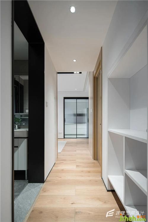 過(guò)道區(qū)域看向廚房,旁邊的柜子可作為一些物件的收納儲(chǔ)物,減少過(guò)道的深度感,增添一些可能性