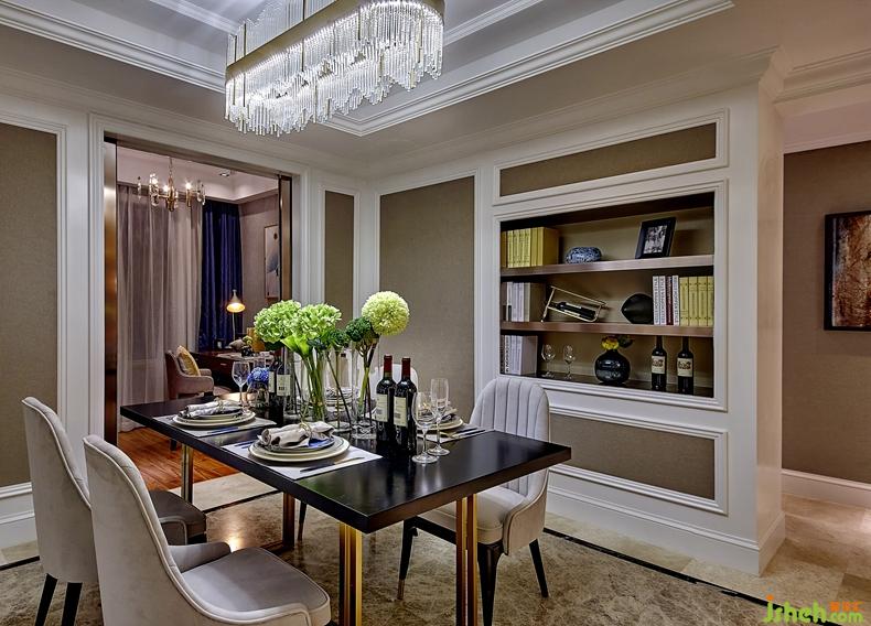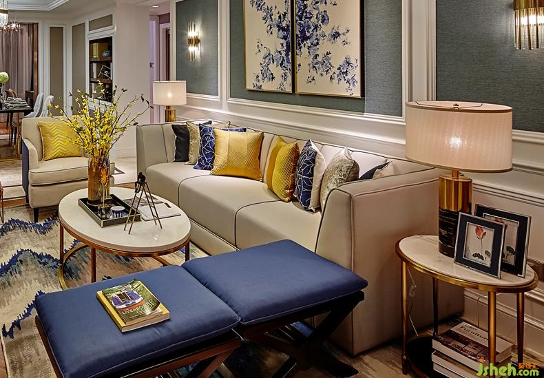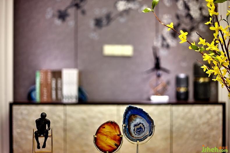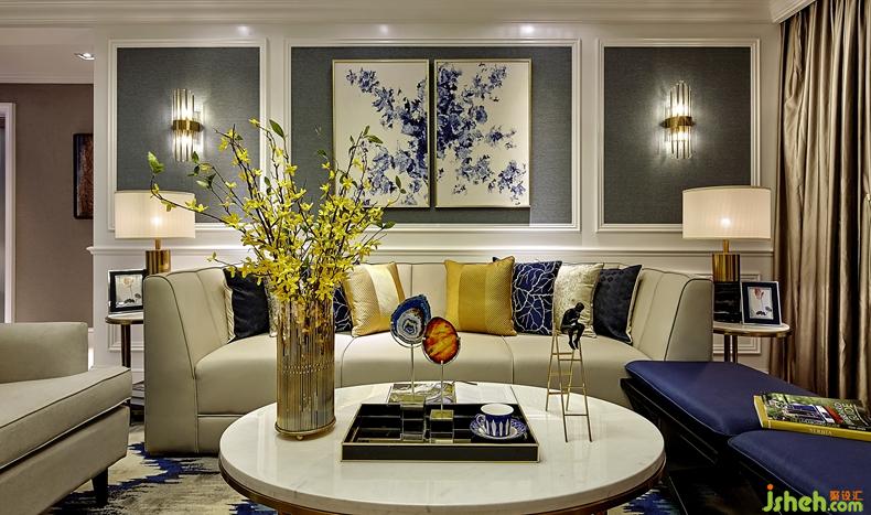 大理石+金屬+水晶 盡顯簡約時尚 , 整體空間色調(diào)以灰色,藍色+黃色 為主,打造出溫馨,舒適的居住空間。
