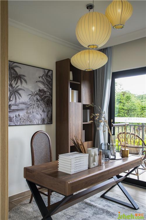 落地窗保留了書(shū)房的通透性,硬朗深色的書(shū)架與書(shū)桌風(fēng)格相比客廳稍微沉穩(wěn)。面對(duì)知識(shí)我們要丟掉一顆浮躁的心,靜靜的去吸收。