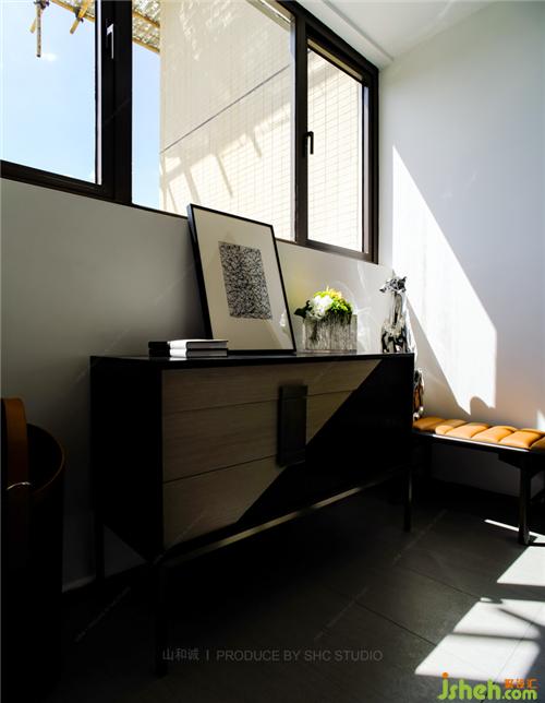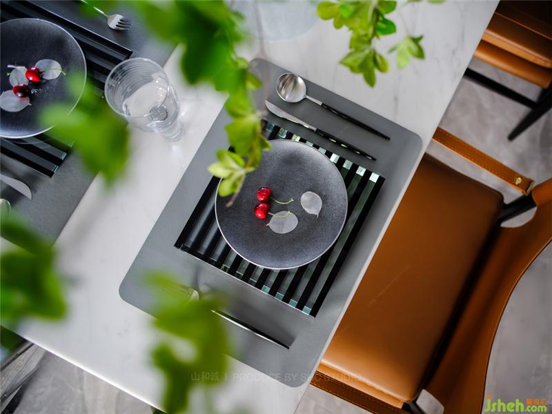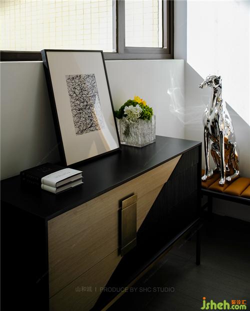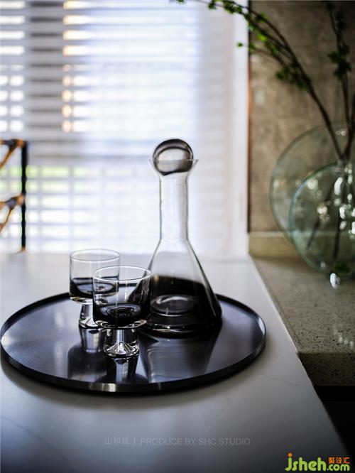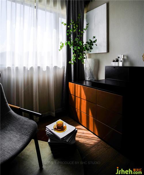 灰色空間沉穩(wěn)大氣,大理石透過光線折射出精致向上的生活態(tài)度,而愛馬仕橙色的配件則賦予空間尊貴的氣息。簾影斑駁,搖曳生輝,于朦朧中,享一方寧靜與奢華。