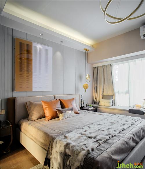 臥室內灰白金的色彩對撞,盡顯高雅與浪漫。再配以溫暖舒適的床品,營造出居家的溫潤質感。大理石桌面的床頭柜與皮質的床上抱枕、優(yōu)雅高貴的皮草相輔相成,突出了整個空間的質感,亦展示了女主人的高雅品味。